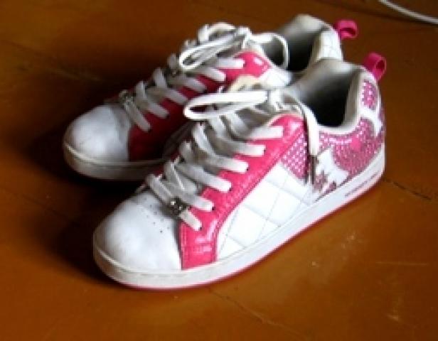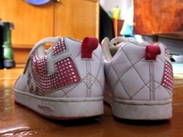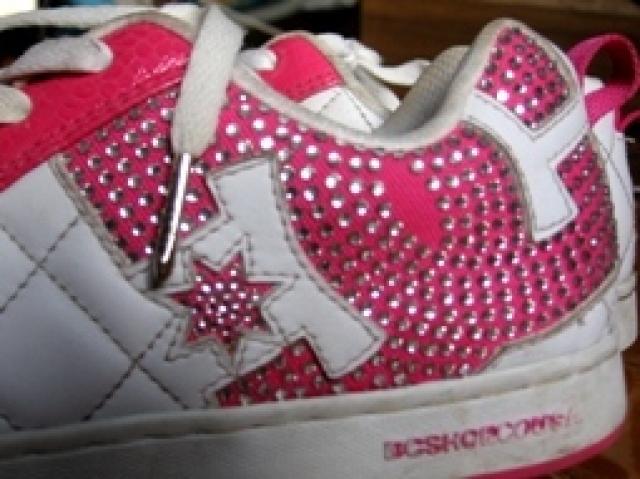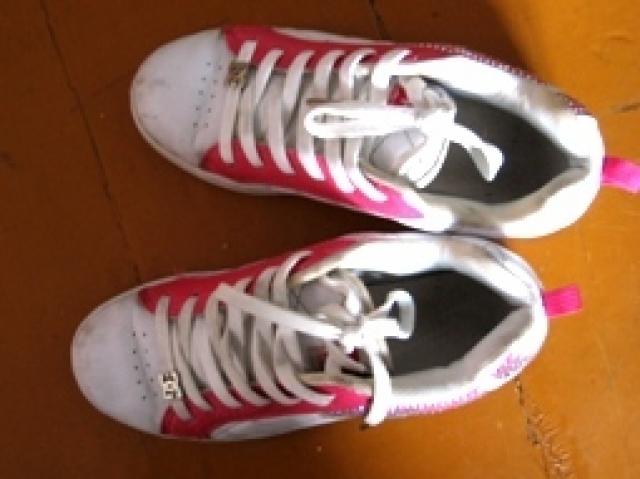 Batai, kedai, kaip pavadinsi, nesugadinsi. DC ar kaip ten jie, 39 dydis, balti su rūžavais ir šone dar blizgučių yra. Pačiam prieky truputuką nubrozdinti, bet nelabai matos.