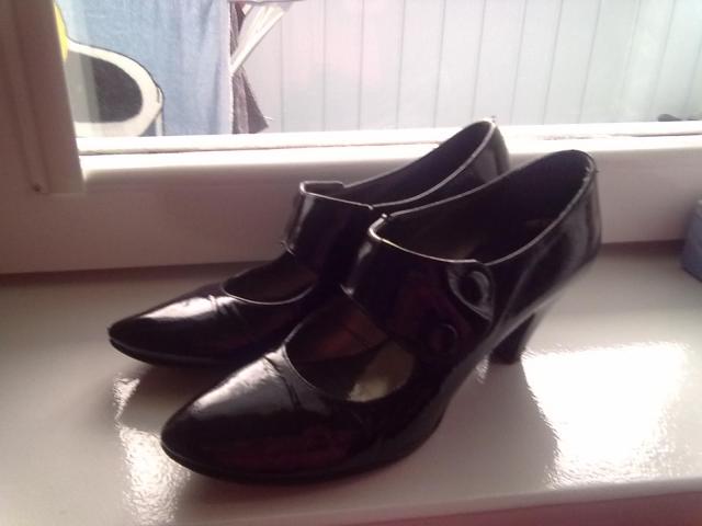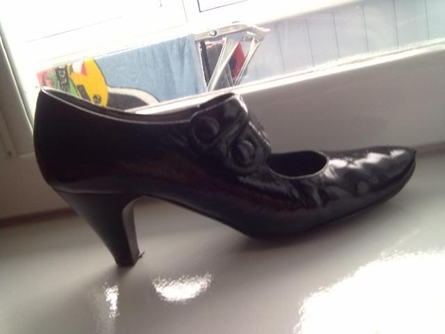 juodi lakuoti bateliai, neaukstas kulniukas,nesioti, siek tiek apibraizyta nosele
