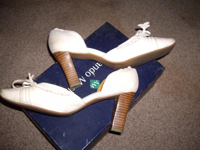 Aveti viena diena per vestuves,spalva baltai geltoni sendinti,papurvinti bet gamykliskai,odiniai tinka kasdieniniam nesiojimui patogus kulnas stabilus,odiniai tiktu ir 38,pirkti zygio btai
