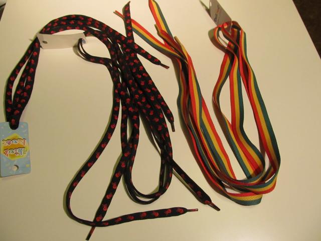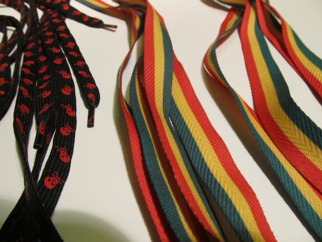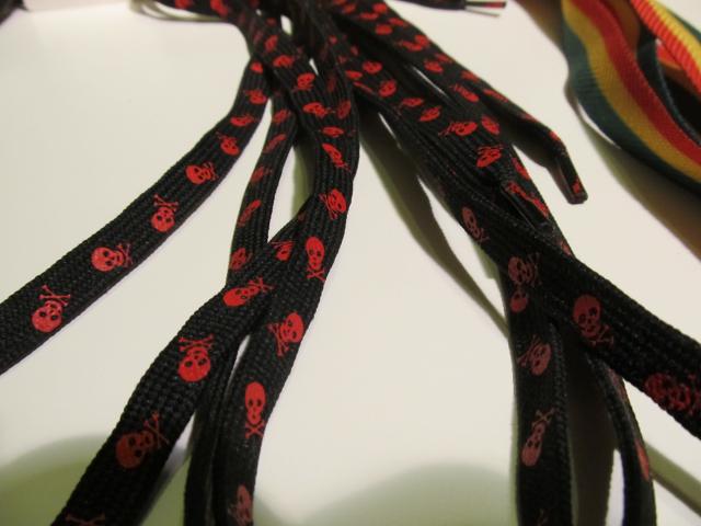 Spalvoti ir linksmi batų raišteliai. 2 poros juodų su kaukolėmis ir viena pora rasta spalvu.