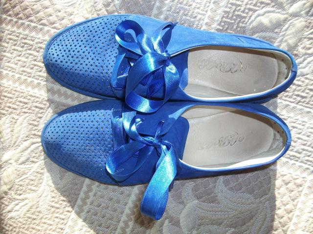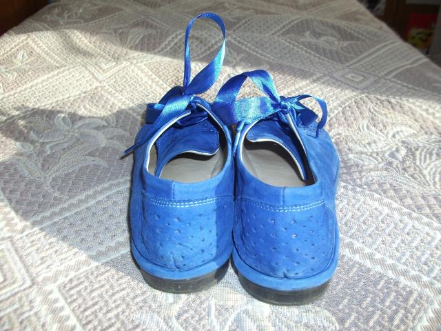 Beveik nenešioti, labai gražios mėlynos spalvos, odiniai, puikiai praleidžia orą ir leidžia kojai kvėpuoti. Raišteliai-kaspinėliai eina kartu.