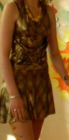 Keletą kartų dėvėta suknelė, tačiau atrodo kaip nauja. Tikslaus dydžio šiuo metu nežinau, nes suknele kaime, bet jei kažką domintų, išsamesnę info galėčiau suteikt. Galiu nuvežt suknelę į Kupiškį, Pakruojį.
