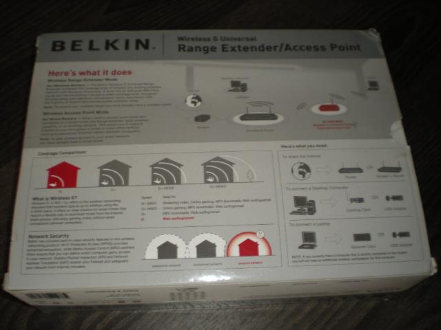Extender padidina jusu esamas bevielio rysio tinklo apreptis retransliuodamos 802.11b / g signalo visoje platesne srityje. Sukurta paprasta saranka operacija, ji puikiai veikia su dauguma marsrutizatoriu ir prieigos taskus, su mygtuko paspaudimu. Kai naudojama prieigos tasku rezima ir prijungti prie laidinio routerio, Range Extender priduria, bevielio rysio galimybes i esama tinkla.