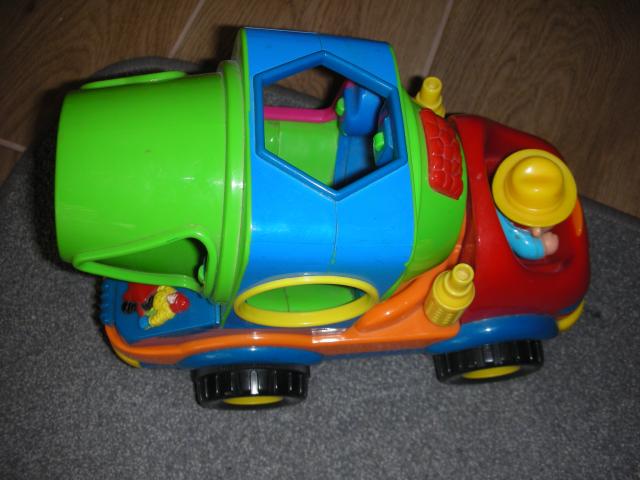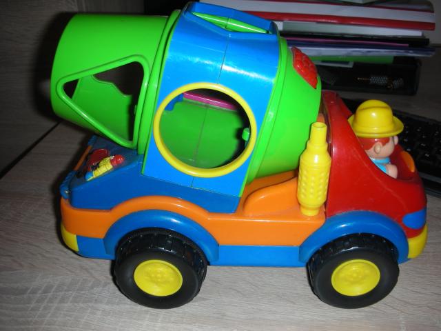 Nemaza betonmaise, tvirto plastiko be astriu kampu tinka patiems maziausiems, dedasi elementai yra uzvedimo , vandens pylimo, cemento pylimo, ir kt. garsai, pametem tik per kraustymasi kaladeles, kurios turetu detis i vidu. Vairuotojas nusiima ir isideda, betono maisykles kausas pasikelia i virsu.