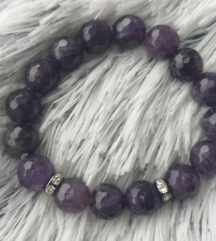 Nauja, nenešiota, rankų darbo briaunuoto ametisto 12 mm pusbrangakmenių apyrankė. Ametistas suteikia ramybę, pusiausvyrą, harmoniją, skatina žmogaus dvasingumą. Pakrauna būstą teigiama energija, pašalina neigiamas emocijas. Saugo nuo blogų minčių. Padeda susikoncentruoti, gerina atmintį, mažina poreikį vertinti. Galima pirkti atskirai arba kaip komplektą su sidabriniais ametisto auskarais.