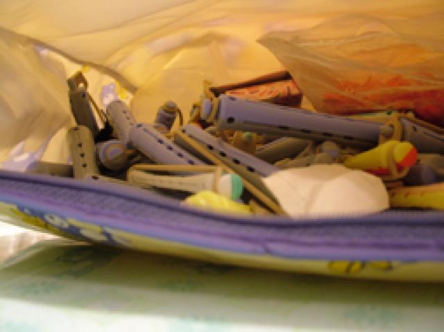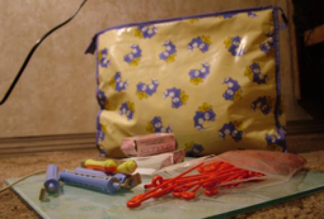 Geltonos spalvos maisiukas su melinais meskiukais. Jo viduje yra bigudukai, popieriukai su plasmasinem juostelem taip pat plaukams sukti