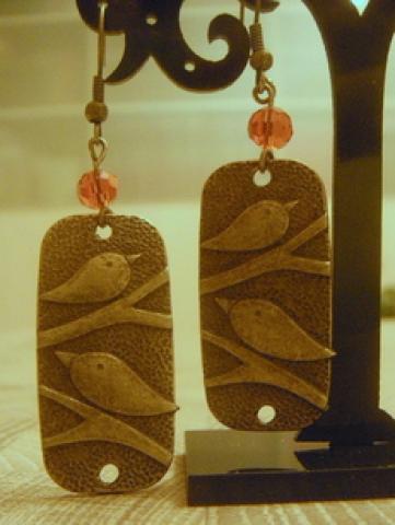 Nauji auskarai su paukščiais ir raudonais karoliukais. Detalės žalvario spalvos