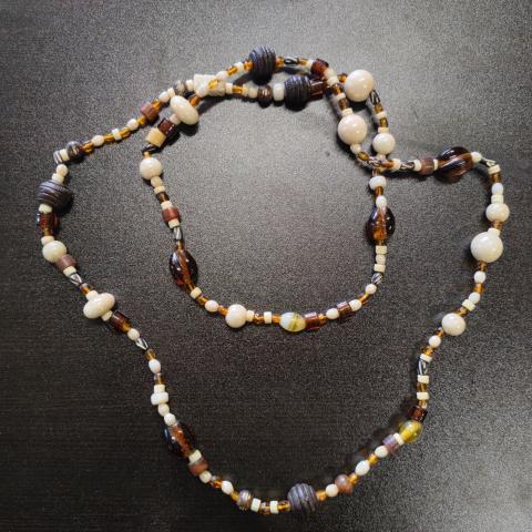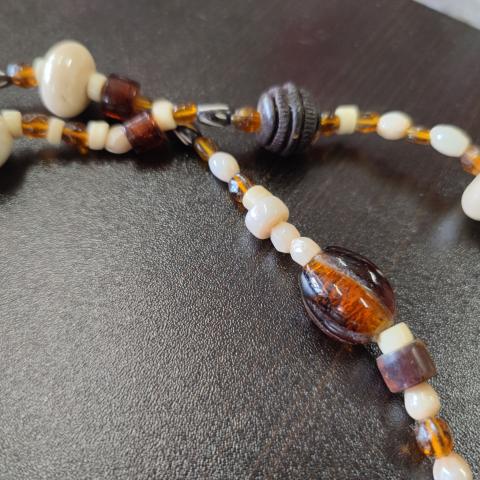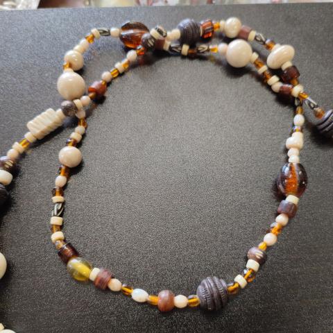 Keramika, stiklas, plastikas. Dukart aplink kaklą. Bendras ilgis apie 106 cm.