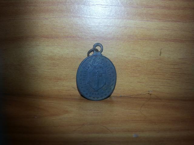 Blaivybės brolijos medaliukas. XIX a. II p. Vario lydinys su cinko ir alavo priemaišomis (bronza), 22,2 19,3 mm, Averse: PARTAWAS[ZWENTA]UZTA KIMA ISZTURESMA IKI GALA. Dievo Motina. Reverse: ATMINIMAS IWEDIMA BLAJWISTES // 1858. M. Kryžius su prikaltu inkaru, tarp kryžiaus skersinių spindulių pluoštai.