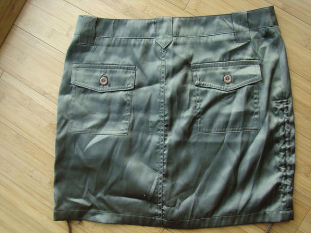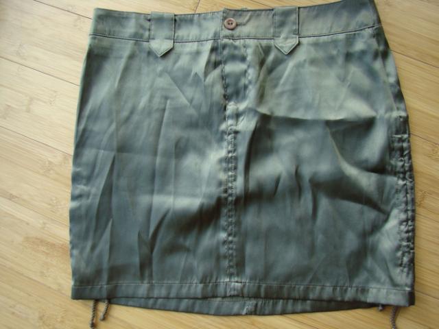 Blizgios, slidžios medžiagos sijonas. Susiraukia su vivelėm per šonus. Chaki spalvos. S/M