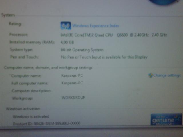 Labai geram stovi stacionarus zaidimu kompiuteris Specifikacija: Intel Quad Q6600 @ 2.40Ghz 4GB of ram nvidia geforce 9500GT 1GB VGA Windous 7, 64 bit, originalus. Kaina su rimtu pirkeju derinama. :)