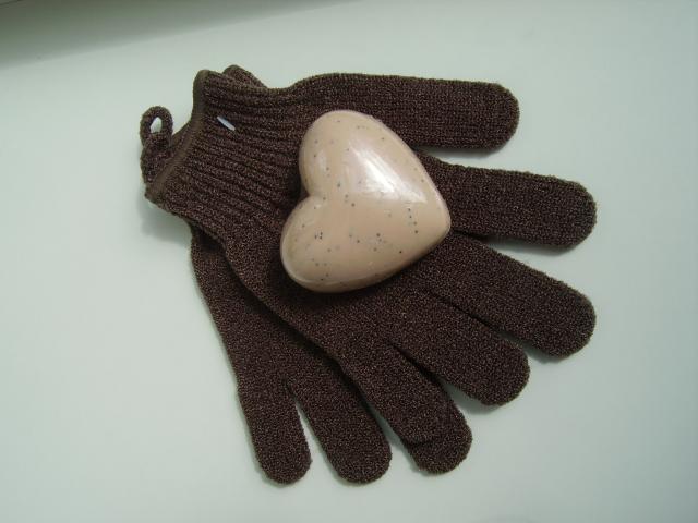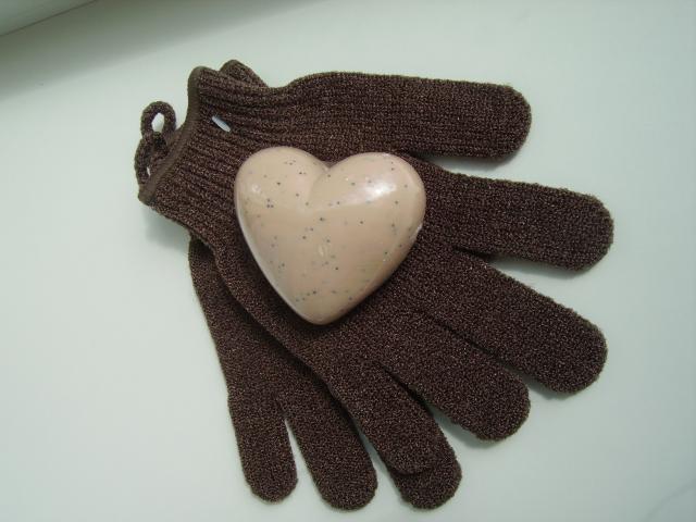 Komplektas: 1) The Body Shop Chocomania širdies formos muilas (100 g) nuprausia odą, ją atgaivina ir pakvėpina šokoladiniu aromatu. Su kokosų smulkintais kevalėliais, kurie šveičia odą. 2) Naujos The Body Shop prausimosi pirštinės