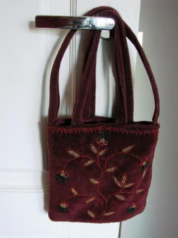 Dailus, švelnios medžiagytės. Yra du variantai rankenoms- dvi trumposios (ilgis 37cm.) arba ilgoji (ilgis 132cm.). Paties rankinuko dydis- 20x18cm.