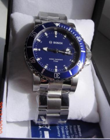 JUBILIEJINIS BOSCH LAIKRODIS, IŠLEISTAS BOSCH 80 METŲ PROGA. RIBOTAS KIEKIS JŲ BUVO PAGAMINTA. Parduodu naują vyrišką laikrodį BOSCH, atsparus vandeniui 5BAR, dėžutė, dokumentai. Ant laikrodžio tebėra apsauginė, plėvelė... Stilingas ir tvirtas.. Tipas - Vyriškas;... Mechanizmas - Kvarcinis (su baterija); Atsparumas vandeniui - WR 50 M (5 BAR) ; Stikliukas - Mineralinis, Dangtelis užsukamas ant sriegio, Sukiojamas laiko ataskaitos žiedas); Datos - dienos rodymas; Ciferblatas - Baltas Mėlynas, Kom