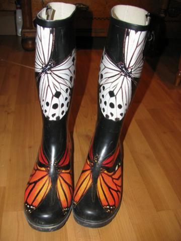 du kartus draugei paskolinau į miestą nueit per lietų, taip kad nenešioti galima sakyt. labai brangūs, todėl į bet ką nekeisiu. (vertė virš 100lt). kaip sakiau-dydis 41, bet tinka ir mažesnei kojai, susiveržia kažkiek blauzda dirželiu.