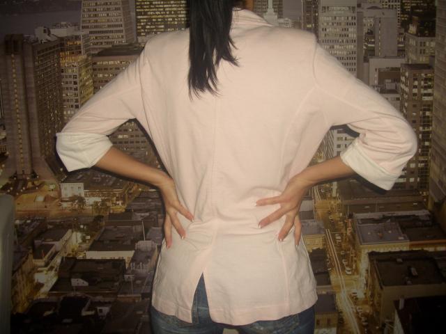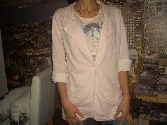 Labai labai gražus Boyfriend švarkas. Švelniai ružavos spalvos su baltom rankovėm. Labai stilingas, šių metų topas!!!Dėvėtas tikrai nedaug. Iš New Look. Yra įsiūti petukai,kad švarkelis turėtų formą. Dydis 38. Pečiai-39cm. Rankovės ilgis(atlenkus baltas rankoves)-42cm. Užlenkus-51cm. Ilgis-70cm. Tiktų ir didesniam dydžiui