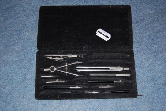 Senas braižybos reikmenų komplektas. Trūksta trijų instrumentų, bet gal kam pravers.