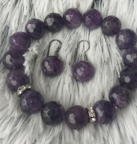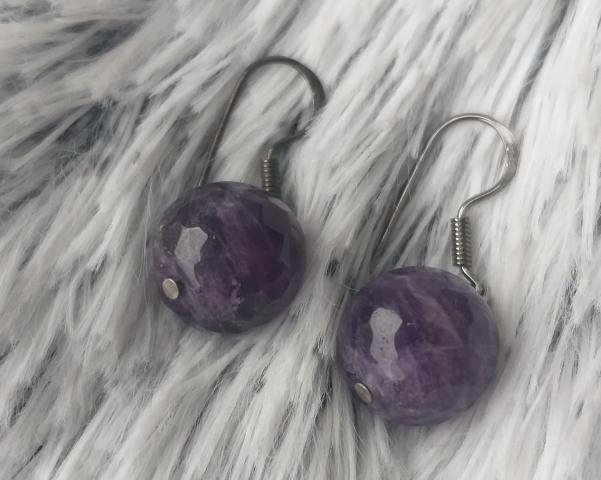 Nauji, nenešioti, rankų darbo sidabriniai (praba 925) briaunuoto ametisto 12 mm pusbrangakmenių auskarai. Ametistas suteikia ramybę, pusiausvyrą, harmoniją, skatina žmogaus dvasingumą. Pakrauna būstą teigiama energija, pašalina neigiamas emocijas. Saugo nuo blogų minčių. Padeda susikoncentruoti, gerina atmintį, mažina poreikį vertinti. Ramina bet kokius prisirišimus, skatina savikontrolę, suteikia emocinio tvirtumo, apvalo visas čakras. Gerina miegą (dėti po pagalve). Galima pirkti atskirai arba kaip komple