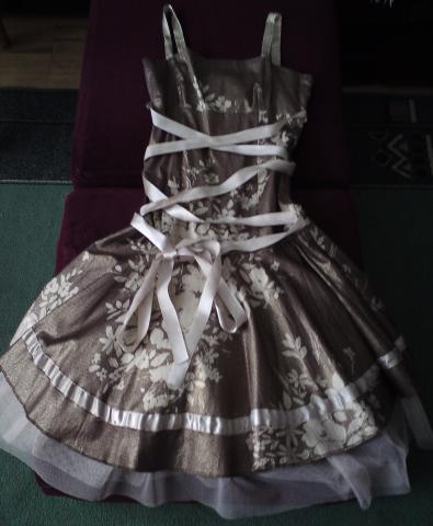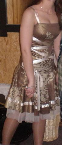 Bronzinė suknelė, dėvėta du kartus, petnešėlės yra prisiųtos mano pačios, todėl jos lengvai nusiėma jas nuardžius. Dydis 10 angliškas, atitinka 38 lietuviską.