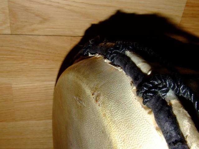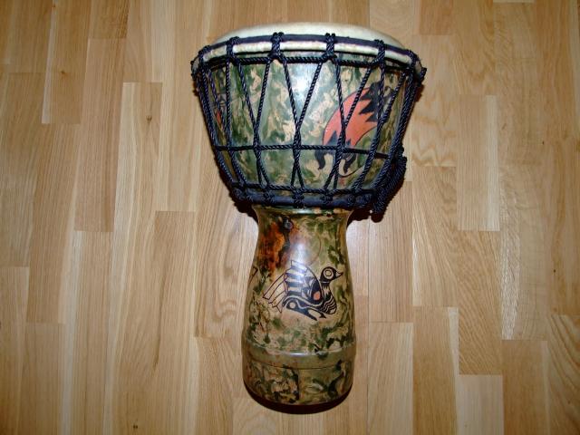 Rankų gamybos vienetinis būgnelis, pirktas Ispanijoje. Beveik negrotas, nes nepatiko :) Piešiniai piešti ranka, aptempta dramblio oda (nuotraukoje matosi poros, o pažejus prieš saulę iš apačios matosi kraujagyslės). Skamba tikrai labai sodriai. Korpusas iš tvirto medžio, nes yra gana sunkus. Būklė gera, nėra nei skilimų , nei plyšimų. Pridedu ir dėklą (mano pasiūtas :)