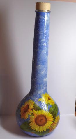 Butelis, dekoruotas dekupažo technika ir ištapytas akrilu. Lakuotas.