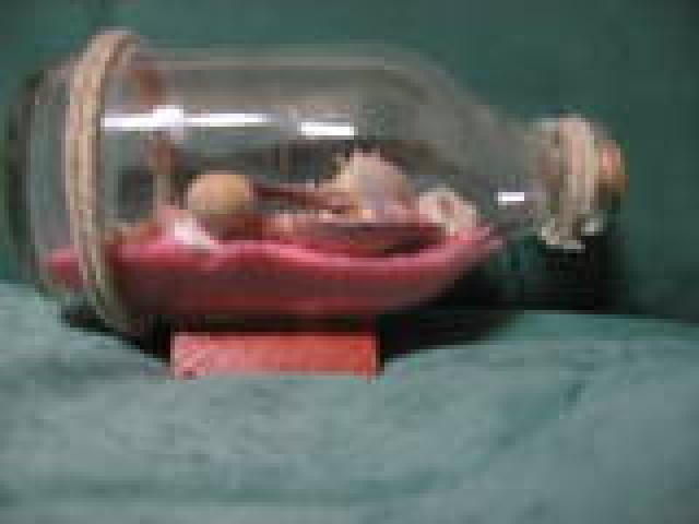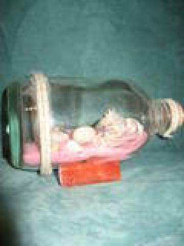 Butelis su medine kojele, rausvu smeliuku viduje ir kriauklytemis