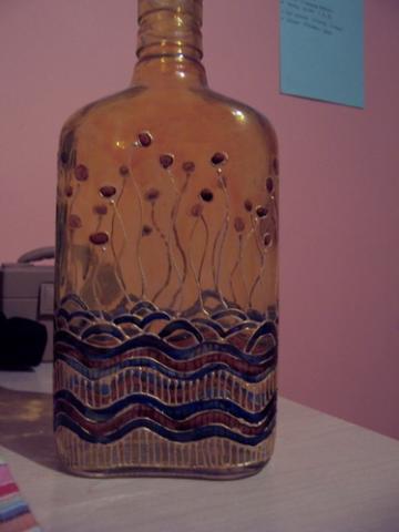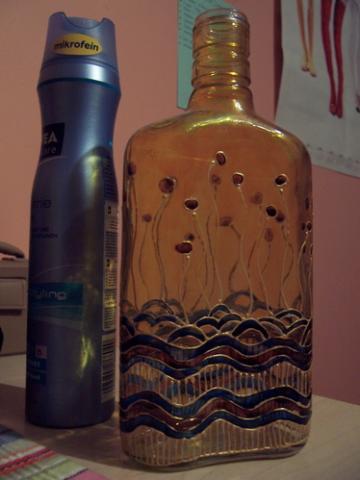stiklinis dekoruotas butelys, gali but naudojamas kaip vazele ar siaip dekoracija