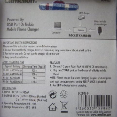Įkroviklis 1-2 AA/AAA Ni-MH/Ni-Cd akumuliatoriams krauti; Įkrovimo laikas ~12h (2500 mAh); LED indikacija; Krunama iš kompiuterio USB; Nokia seno tipo kroviklio (įsigyjama atskirai) Įkrovikliui 2 metų gamintojo garantija. (BE ELEMENTŲ)