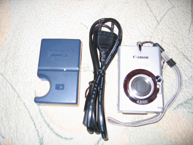 Puikiai veikiantis Canon IXUS 430 skaitmeninis fotoaparatas. Pakeista matrica, trūkumas - kažkada jis buvo sudrėkęs (apgaravęs), dabar nekontaktuoja kažkas su baterija - ją iškrauna nors pats aparatas būna išjungtas, sprendimas - išjungus aparatą bateriją ištraukti. Į komplektą įeina baterijos kroviklis ir juostelė, nėra pačios baterijos (iš eBay 10 Lt) ir laido jungtis prie kompiuterio.