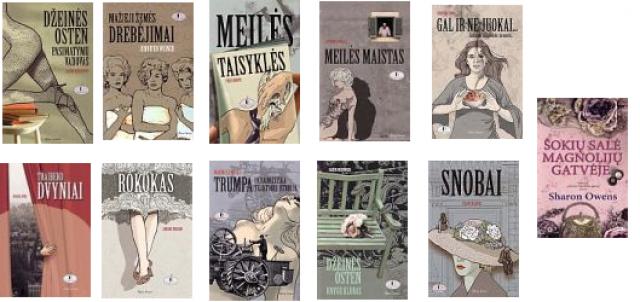 Henderson Lauren “Džeinės Osten pasimatymų vadovas” 10 lt. Pine Rachel “Traibeko dvyniai” 10 lt. Weiner Jennifer “Mažieji žemės drebėjimai” 12 lt North Freya “Meilės taisyklės” 12 lt. Trigiani Adriana “Rokokas” 10 lt. Lewycka Marina “Trumpa ukrainietiška traktorių istorija” 10 lt. Fowler Karen Joy “Džeinės Osten knygų klubas” 10 lt. Fellowes Julian “Snobai” 10 lt. Jones Christina “Gal ir ne juokai… Tad gerai pagalvokite, ko norėti” 11 lt Capella Anthony “Meilės maistas” 12 lt. Owens Sharon “Šokių