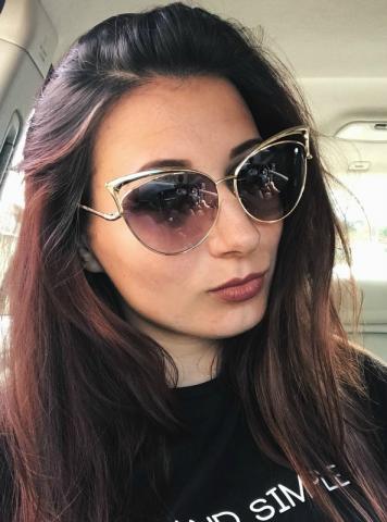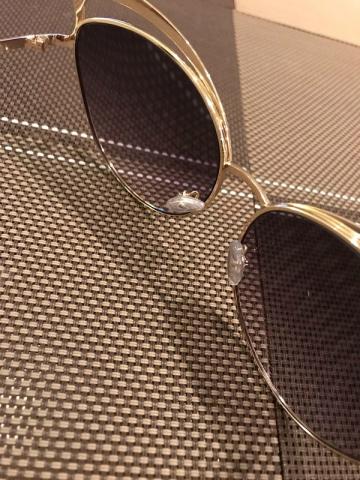 Defektu neturi, karta uzsideti. Remas ir kojeles metalines, suverztos varztukais. Pirkti is https://www.mirinacollections.com/collections/cat-eye/products/cat-eye-gold-w-smoke-lens-n014-goldgray