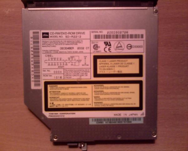 Nešiojamo kompiuterio CD/DVD diskų skaitytuvas pagamintas Japonijoje. Lazerio klasė 1.