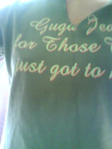 Chaki spalvos maikė su šviesiai žaliai/raudonai parašytu užrašu "Guga jeans for those that just got to have". "U" formos iškirptė. P.S. Jei ką, tai maikė moteriška ;D