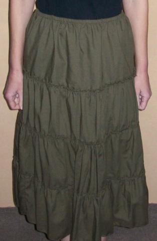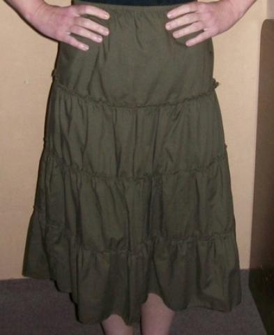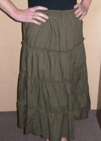 M dydžio tamsiai chaki spalvos sijonukas. Ant etiketės parašytas dydis S, bet S dydžiui per didelis. Liemuo ant gumos, todėl prisitaiko prie įvairios apimties. Būklė labai gera.