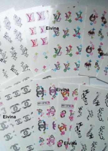 Nauji vardiniai įvairūs labai madingi nagų ženkliukai. Yra - Chanel, Louis Vuitton LV, D&G. Vienas lapelis - 10 Lt. ( mano daiktuose yra įkeltos atskiros lapelių nuotraukos ). NEMAINAU.