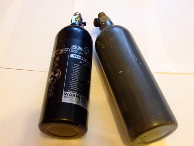 CO2 (angliarūgštės) balionai dažasvydžio markeriams. Abu su on-off vožtuvais. Su vienu pilnu balionu galima iššaudyti apie 700-800 kamuoliukų. Juodo jau nėra.