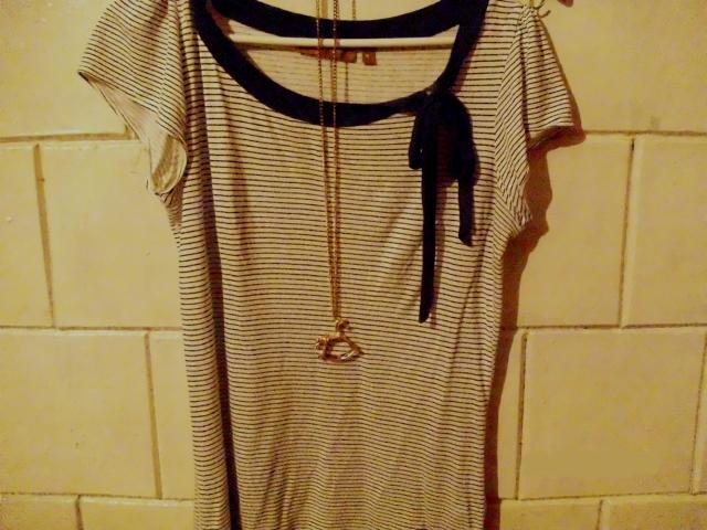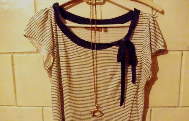 Marinistinė puošni maikutė su rišamu kaspinėliu virš krutinės.Nešiota vos du kartus,pirkta užsienyje.Siuntimo kaina įskaičiuota.