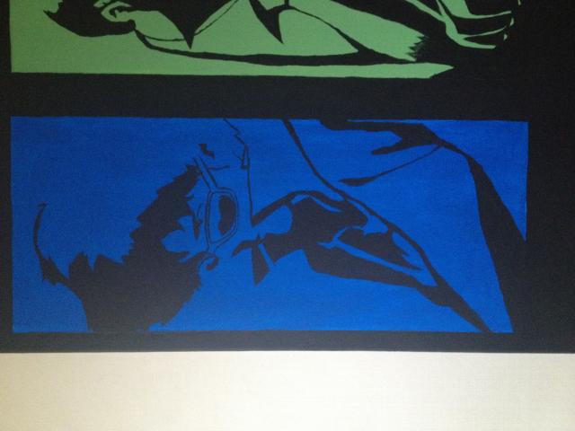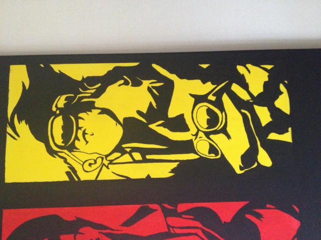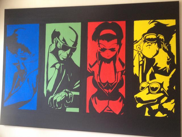 Didelis Cowboy Bebop paveikslas, tapytas berods akriliniais dažais (pirktas senokai, o nesu meno žinovas, tad dažų rūšių neskiriu). Puikiai tiks, jei kambaryje trūksta kažko spalvingo, bet neatrodančio vaikiškai.