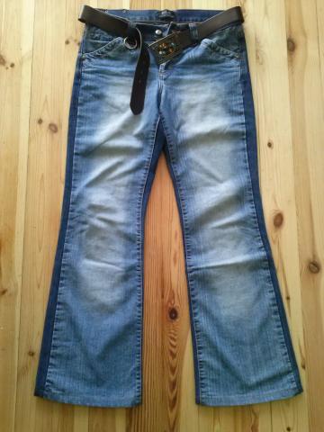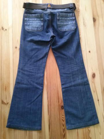 Elegantiški ir dailūs firminiai džinsai, ne lykros, todėl man netinka... Priekyje šviesus džinsas, užpakalinė dalis - rantuoto tamsaus džinso. Ilgis 100 cm Liemuo 40 cm Per klubus 49 cm Minusiuskas 3 foto - istrūkęs ženkliukas (tiesą sakant, nesimato, jei nepasakysi)