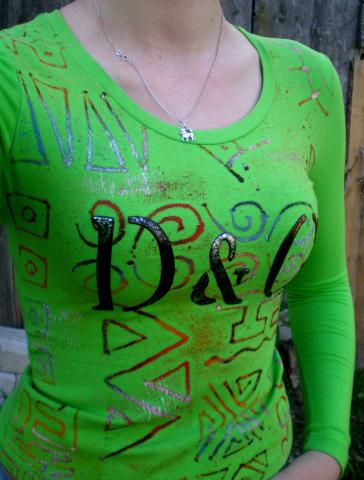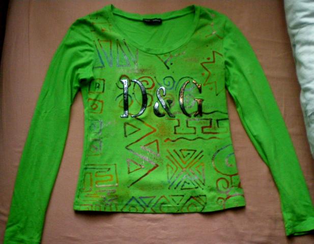 D & G salotinė palaidinė. Spalva puikiai išlaikyta. Palaidinė patogi, elastinga, gražiai aptempia, ryški. Defektai: patemptas nugaroje siūliukas ir truputėlį pradėjusios irti siūlės rankovėse (galiu atsiųsti nuotrauką į e-mail, nes neįkelia čia). Jie vos matomi, pati pastebėjau tik fotografuojant. Bendras ilgis ~50cm. Dydis S/M.