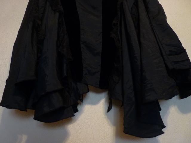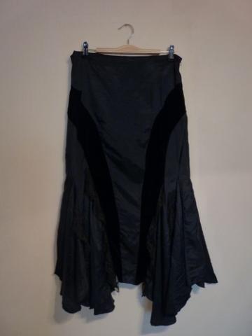Labai puošnus, slidžios medžiagos sijonas, dekoruotas aksomu bei gipiūru. Į apačią išplatėja, todėl gražiai krenta. Išties, esu nukirpusi etiketę, kadangi sijonas labai plonos medžiagosir pastaroji trukdė, todėl tikslaus dydžio nežinau. Spėju S/M.