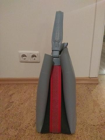 Parduodama kelis kartu nešiota įdomaus modelio rankinė. Būklė puiki, defektų nėra. Oda dirbtinė. Šonai žalios spalvos su raudonos spalvos juosta, puošta kniedėmis. Rankena viena, puošta kniedėmis. Užsisega užtrauktuku. Viduje padalinta į tris dalis, vidinė susisega spaustuku. Vidinėje dalyje yra užtrauktuku užsegama ir be užtrauktuko mažos kišenėlės. Išmatavimai: aukštis su rankena 50 cm; aukštis 31 cm; plotis viršuje 26 cm; plotis apačioje 34 cm; storis 15 cm