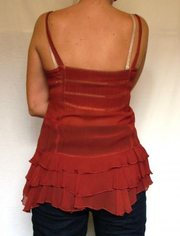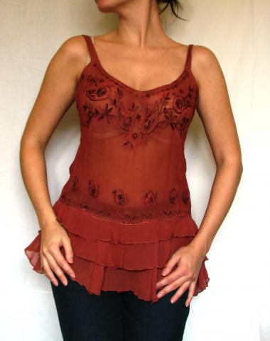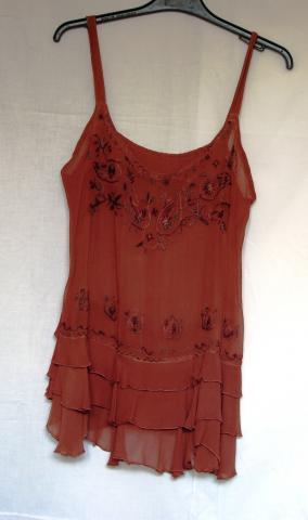 Daili madinga palaidinė su gražiais išsiuvinėjimais priekyje. Šiek tiek permatoma. Tiktų didesniam M dydžiui. Išmatavimai: ties krūtine 42cm., ties klubais 45cm.