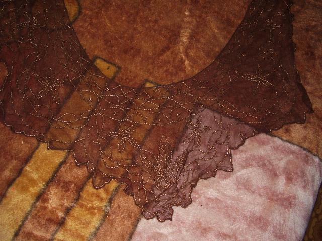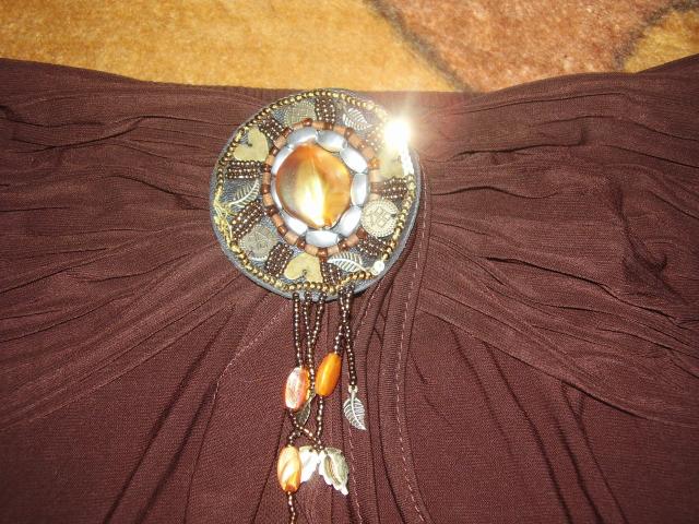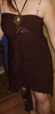 Daili ruda suknele be rankovių susirišama per kakla, gražus papuošalas is karoliuku ties krutine, ruda juosta einanti per visą suknelę suteikia lengvumo pojūtį. Prie sukneles pridedamas gražus apsiaustelis- skraiste dekoruotas rudais karoliukais.