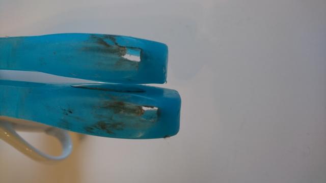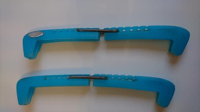 Dailiojo čiuožimo pačiūžų ašmenų apsaugos. Apsaugos stipriai naudotos su skylėmis, matosi nuotraukoje.