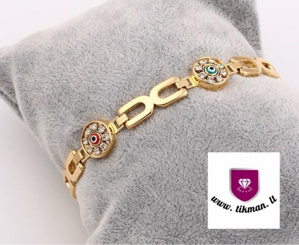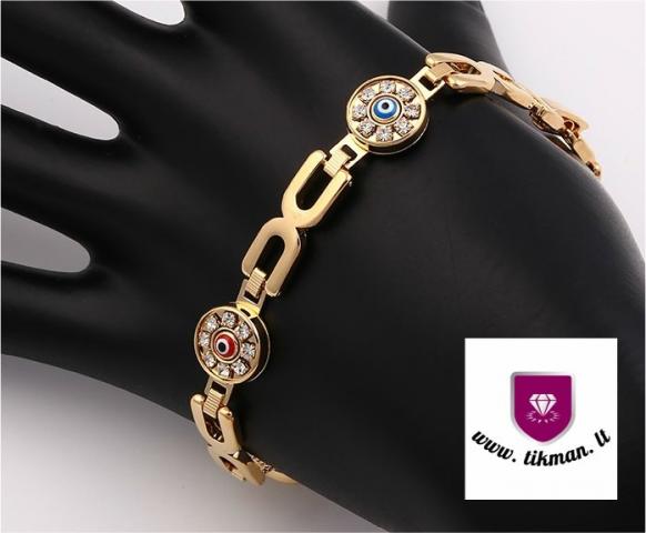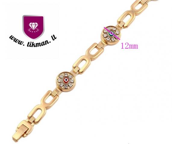 Medicininio aukso apyrankė su cirkonių akutėmis. Balti cirkoniai juosia keturių skirtingų spalvų akutes. Ilgis: 21 cm Svoris: 18 g