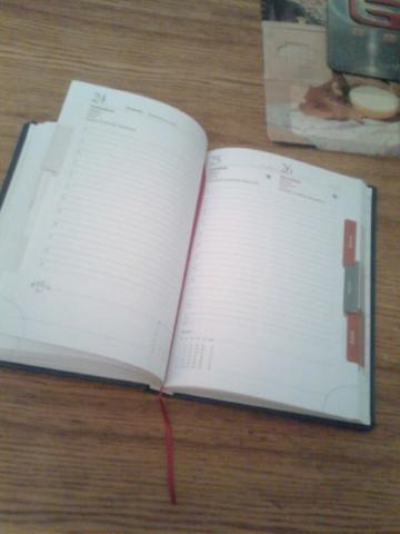Nauja, 2009 metu darbo knyga. Kiekvienai dienai skirtas puslapis. Kiekviename lape yra menesio keldoriukas, surasyti vardadieniai. Yra skirtukas.