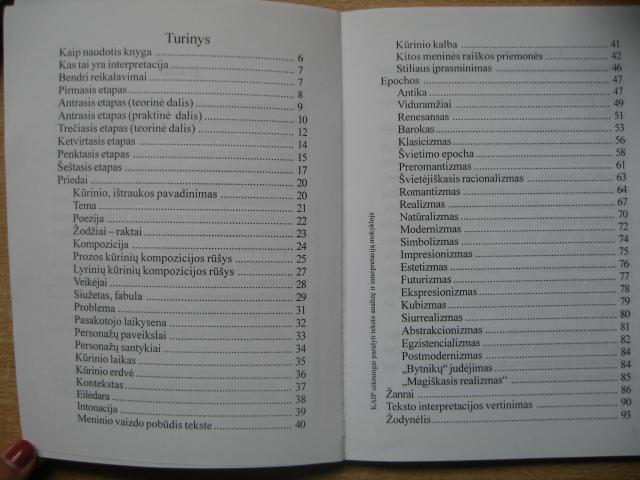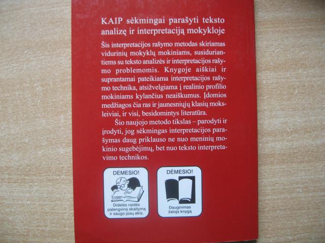 Knyga puikios būklės, tinka 9-12 kl. mokiniams, aiškiai išdėstyta, nuo ko reiktų pradėti, ką rektų rašyti ir parašyti norint atlikti gėrą interpretaciją, pateiktas žodinėlis sąvokų, meninės raiškos priemonių, kurie reikalingi interpretuojant tekstą kaip pvz. metonimija, alegorija, reversija ir pan. Sudarytas glaustas kiekvienos epochos pagrindinių tezių sąvadas. Man asmeniškai labai pravertė ši knyga ruošiantis lietuvių kalbos egzaminui :) Tradiciškai, nuotraukose pridedu ir turinį :)