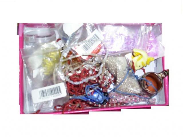 daugybe karoliuku, gintriuku ir kitu niekuciu. yra ir suvertu apyrankiu ir pakeliuose karoliuku, zodziu, daugybe visko.
