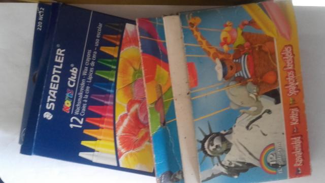 Vaškinių kreidelių piešimui rinkinukai (Bulgarija,Čekija). Skirti tiek mėgėjiškam piešimui, tiek profesionaliam, netoksiškos. Yra 12 vnt spalvų ir didesni. Kaina - 2 EUR, Didesni - 3,5 EUR.